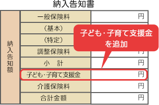 当健保から送付する納入告知書に、第3の費目として「子ども・子育て支援金」が追加されますので、ご確認の上納付をお願いいたします。