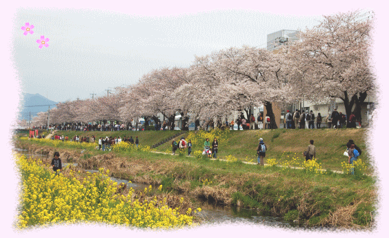 | 2009年4月4日(土)、春の「健康ウォーク」が豊川市で開催されました。 まさに「贅沢春景色・佐奈川 桜と菜の花のハーモニー」コース!満開の桜と可愛らしい菜の花の道を10km(約2時間40分)、心地よく歩きました。 |
