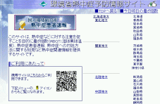 ![]() 熱中症などに対する注意を促すことを目的に暑さ指数(WBGT:湿球黒球温度)、熱中症患者速報、熱中症への対処方法に関する知見など熱中症関連情報を提供するサイトです。 携帯でアクセスできる「今日明日の暑さ指数」「暑さ指数速報」も便利です。 |