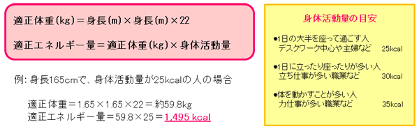 そもそも太ってしまうのは、普段の活動量に見合う以上の食事(エネルギー)をとりすぎているから。では、自分の適正な体重とエネルギーを算出してみましょう。
