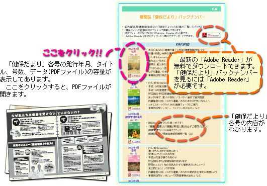 「健保だより」バックナンバーより、ホームページでもご覧いただけます(拡大しても読みやすくきれいなPDFファイルで掲載しています)。